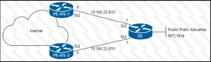 The CE router is peering with both PE routers and advertising a public prefix to the internet. Routing to and from this prefix will be asymmetric under certain network conditions, but packets must not be discarded. Which configuration must an engineer apply to the two PE routers so that they validate reverse packet forwarding for packets entering their Gi2 interfaces and drop traffic from the RFC1918 space?