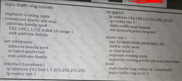 The configuration shown is for the head-end router of a Cisco MPLS TE tunnel with segment routing. This setup involves commands related to segment routing and MPLS traffic engineering tunnels, such as “mpls traffic-eng tunnels”, “segment-routing mpls”, and “segment-routing prefix-sid-map advertise-local”. These commands configure the head-end router to effectively create and manage TE tunnels using segment routing. References: Implementing and Operating Cisco Service Provider Network Core Technologies (SPCOR) - Cisco SPCOR Training & Certification.