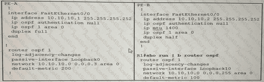 The OSPF neighbor relationship is not establishing due to a mismatch in MTU (Maximum Transmission Unit) settings on the interfaces of PE-A and PE-B routers. On PE-A, there is no MTU configuration under the interface FastEthernet0/0, which means it is using the default MTU setting. However, on PE-B, the MTU is explicitly set to 1400 bytes with “ip mtu 1400” command under interface FastEthernet0/0. OSPF requires that both ends of a point-to-point link have matching MTU sizes to form a neighbor relationship; otherwise, OSPF adjacency will not be established.