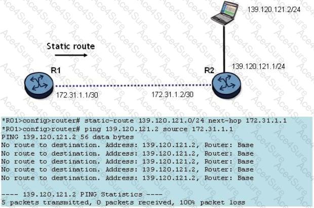 A static route has been configured on router R1 to reach the PC at 139.120.121.2. What might be causing the ping to fail?