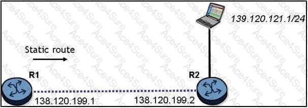 What is the command to configure a static route on the Alcatel-Lucent 7750 SR router R1 to reach the network behind router R2?