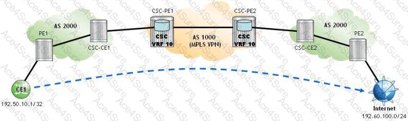 A Carrier Supporting Carrier (CSC) VPRN is configured for a customer carrier who is an Internet Service Provider (ISP). If CE1 sends an IP packet to 192.60.100.1, which of the following is FALSE?