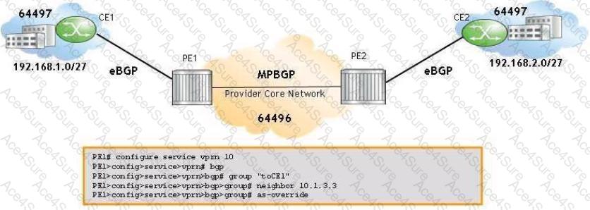 AS-override is configured on PE1 to eliminate the BGP loops. What is the expected AS-Path in the VPN-IPv4 route 64496:10:192.168.2.0/27 received by PE1?