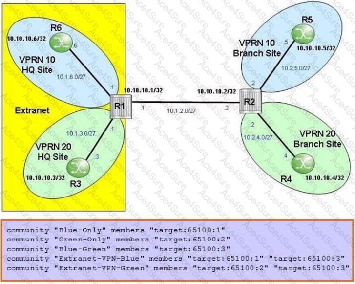 For the extranet VPRN and community lists shown, which of the following communities will be included in the export policy applied to VPRN 20 on router R2?