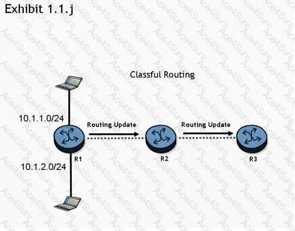 Routers R1 „ R2, and R3 are running a classful routing protocol between them. Assuming that router R1 advertises all directly connected networks, how will these networks be represented in router R3's routing table?