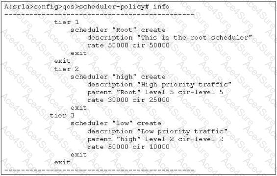 Click the exhibit button below. Given this scheduler-policy configuration, which of the following can be said about the scheduler called "high"? (Choose two)