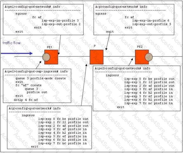 Click the exhibit button below. Traffic arriving at router PE 1 is marked with a dot1p value of 4. Given the network policies applied on the routers in the diagram below, what is the EXP value of packets arriving at router PE 2?