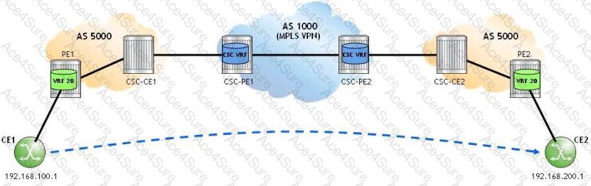 A Carrier Supporting Carrier (CSC) VPRN is configured for a customer carrier who is a BGP/MPLS service provider. If CE1 sends an IP packet to 192.168.200.1, which of the following is FALSE?