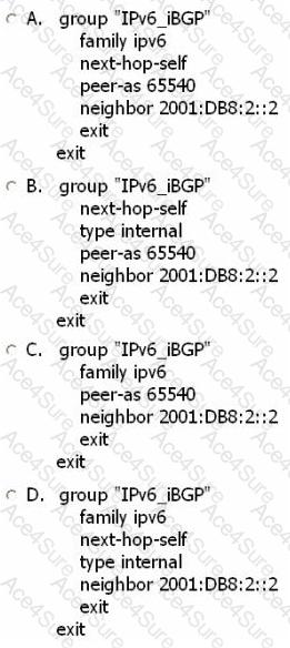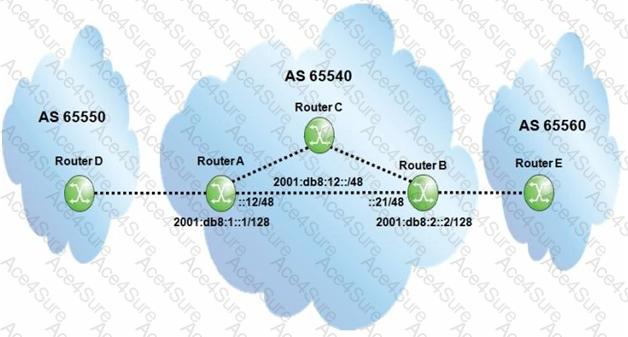 Assume all router-IDs are properly configured, and global IPv6 addresses are used to establish eBGP sessions. Which of the following configurations is required on router A so that router B can exchange traffic with router D?