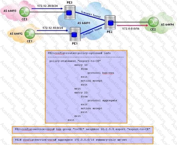 Based on the VPRN aggregate route configuration, which routes are advertised to CE2?