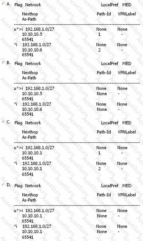 Router R1 is a route reflector with clients R2, R5 and R6. Router R3 advertises the prefix 192.168.1.0/27 to routers R5 and R6. Assuming that routers R1, R2 and R4 are configured with "add-paths ipv4 send 2 receive", what is the expected output of "show router bgp routes" when executed on router R2?
