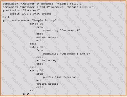 The policy shown is configured on an Alcatel-Lucent 7750 SR to implement an extranet VPRN between the main sites of two separate VPRNs. Route target "target:65100:2" is used for Customer 1 routes, and route target "target:65100:3" is used for Extranet routes. How should this policy be applied?