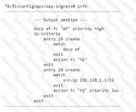 In the image shown above, the SAP-ingress policy is applied properly to a Nokia 7750 SR. A traffic stream is received from an IP address of 192.168.1.1 with DSCP set to EF. Which forwarding class and priority level is used for this traffic stream?
