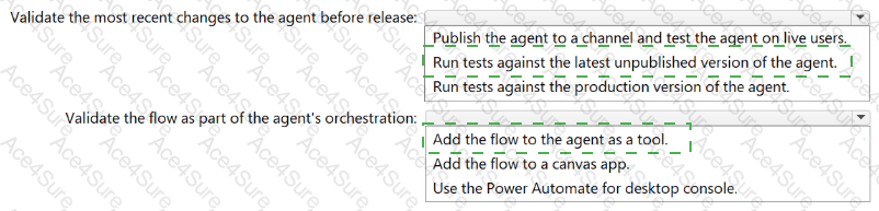 Validate most recent changes → Run tests against the latest unpublished version of the agent; Validate the flow as part of orchestration → Add the flow to the agent as a tool