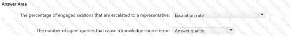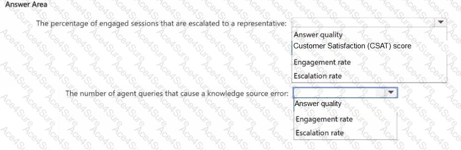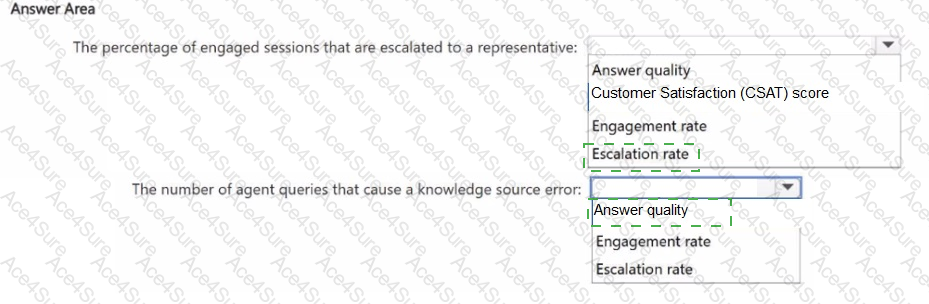 You use Microsoft Copilot Studio analytics to analyze the performance of a deployed Copilot Studio agent. You need to identify which performance metrics to use to measure the following: