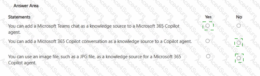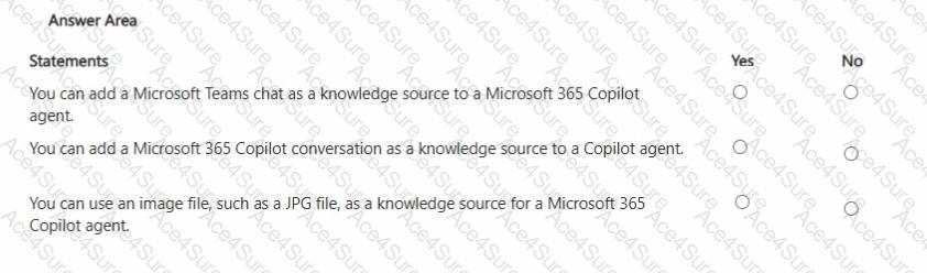 Finally, JPG images are not supported as knowledge-source file types . Microsoft’s supported file types for agent knowledge include documents like .doc/.docx, .pdf, .ppt/.pptx, .txt, and Excel formats (.xls/.xlsx), but not image formats. Therefore, you cannot use a JPG as a knowledge source for a Copilot agent.