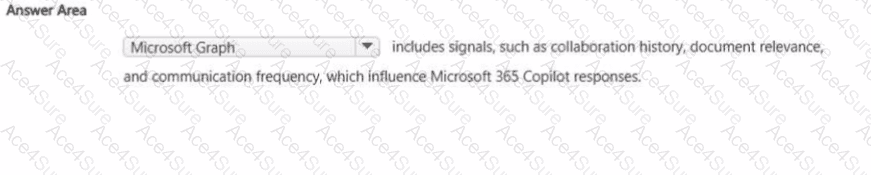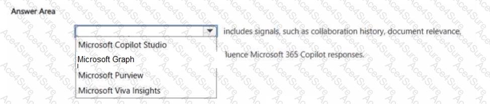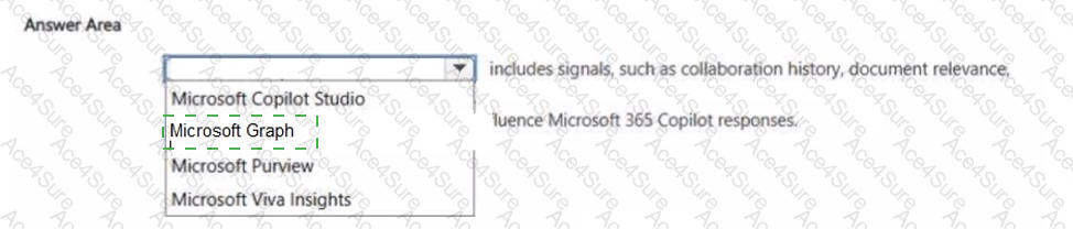 The other options do not fit this sentence. Microsoft Copilot Studio is used to build and customize copilots and agents. Microsoft Purview is for compliance, governance, and data protection. Microsoft Viva Insights provides workplace analytics and insights, but it is not the core service described by Microsoft as supplying the contextual signals that ground Microsoft 365 Copilot responses. Therefore, the only option that correctly completes the sentence is Microsoft Graph .
