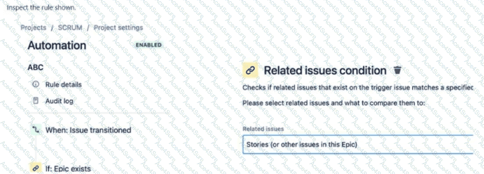 Why This Fits: The trigger issue is the issue being transitioned in the When: Issue transitioned component, and the Related issues condition does not introduce a new transition. Thus, the trigger issue (Option D) is the issue being transitioned in the rule’s context.