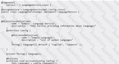 To read a list of spoken languages from the configuration of an OSGi service, the correct snippet to use is Option B. This snippet demonstrates how to define and read the configuration properties using the OSGi R7 annotations (@ObjectClassDefinition and @AttributeDefinition), which are the recommended way for defining OSGi configurations in modern AEM projects.