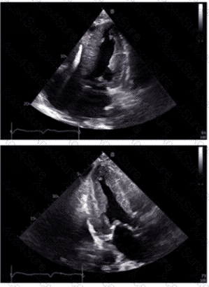 The 2D echocardiographic images show apical ballooning, a hallmark of Takotsubo cardiomyopathy, where the apex is akinetic or dyskinetic and the basal segments contract normally or hypercontract. Doppler images show findings consistent with impaired ventricular function.