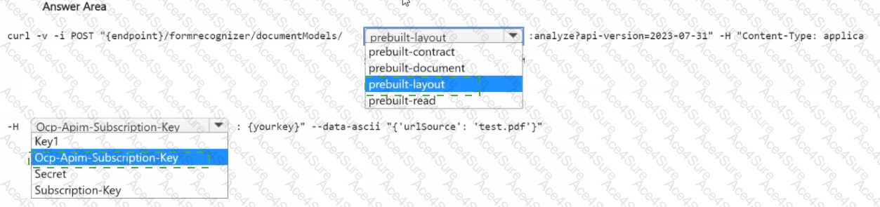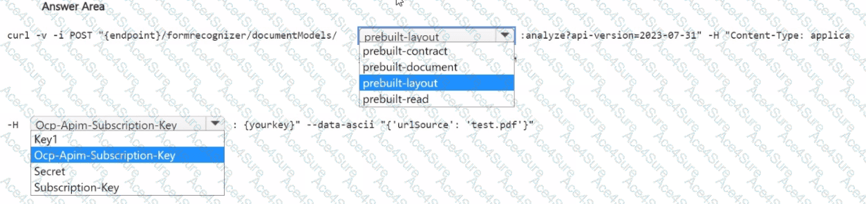 This uses a single analyze call to the prebuilt-layout model to extract the tables and authenticates with the Ocp-Apim-Subscription-Key header—matching the two selections in the answer area. The model matrix and overview pages also confirm Layout supports tables. Microsoft Learn