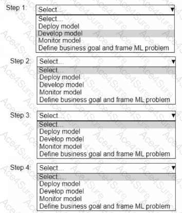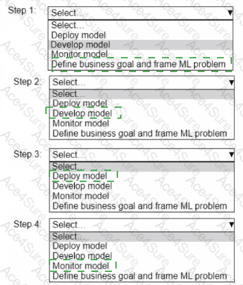 The hotspot provides four steps, each with the same dropdown options: "Select...," "Deploy model," "Develop model," "Monitor model," and "Define business goal and frame ML problem." The correct selections are: