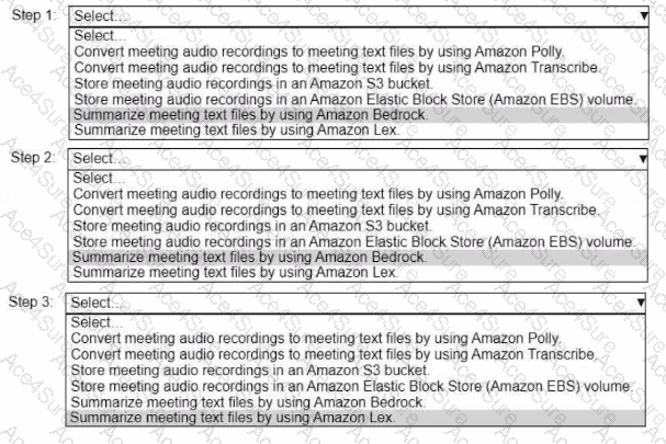 Convert meeting audio recordings to meeting text files by using Amazon Polly.Amazon Polly is a text-to-speech service, not for converting audio to text. This option is incorrect and not used.