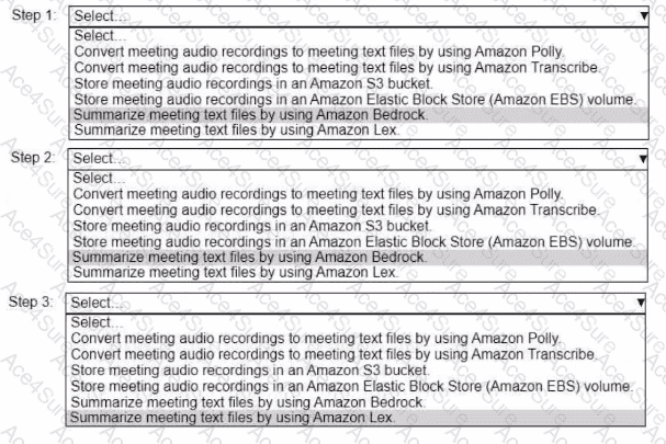 Convert meeting audio recordings to meeting text files by using Amazon Polly.Amazon Polly is a text-to-speech service, not for converting audio to text. This option is incorrect and not used.