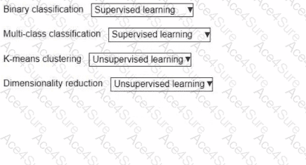 The hotspot lists four use cases, each with a dropdown containing "Select...," "Supervised learning," and "Unsupervised learning." The correct selections are: