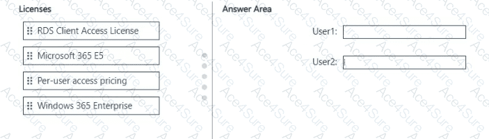 Which license should you recommend for each user? To answer, drag the appropriate licenses to the correct users. Each license may be used once, more than once, or not at all. You may need to drag the split bar between panes or scroll to view content.