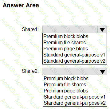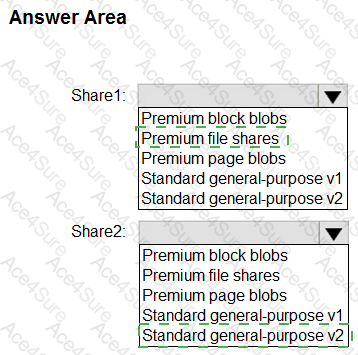 You plan to deploy two Azure file shares named Share1 and Share2 that will be used with Azure Virtual Desktop. Share1 will contain at least 100 GB of data and must be stored on SSDs. Share2 must be able to switch between Transaction optimized and Cool storage tiers and must be stored on HDDs.