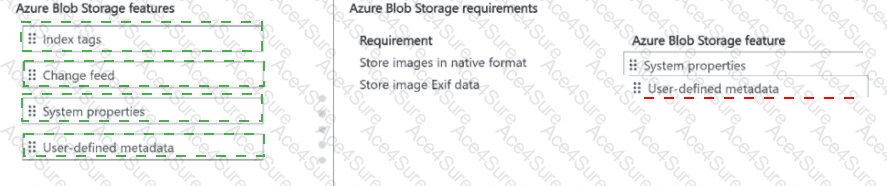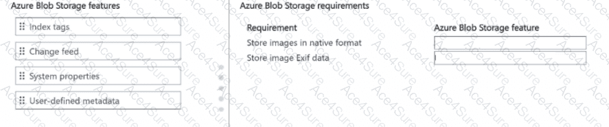 Which Azure Blob Storage feature should you use? To answer, move the appropriate Azure Blob Storage features to the correct requirements. You may use each Azure Blob Storage feature once, more than once, or not at all. You may need to move the split bar between panes or scroll to view content