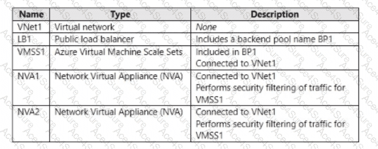 You need to recommend a load balancing solution that will distribute incoming traffic for VMSS1 across NVA1 and NVA2. The solution must minimize administrative effort.