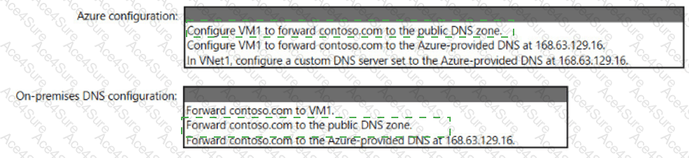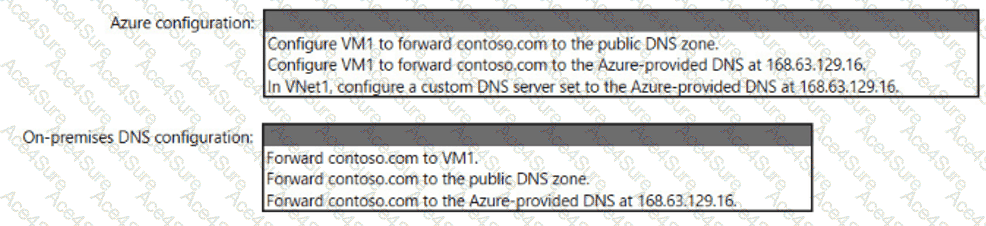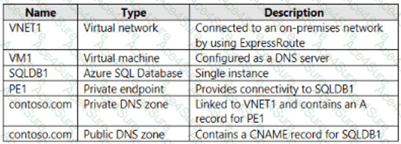 You need to design a solution that provides on-premises network connectivity to SQLDB1 through PE1. How should you configure name resolution? To answer, select the appropriate options in the answer area.
