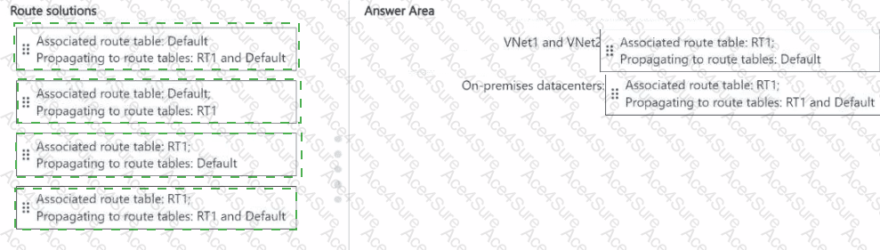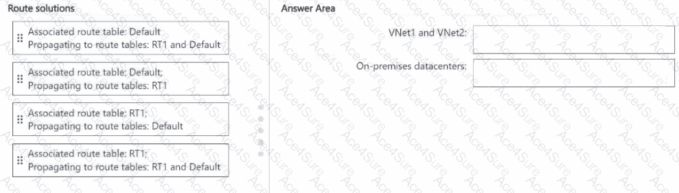 How should you configure routing for VNet1 and VNet2 and for both on-premises datacenters? To answer, drag the appropriate route tables and route table propagation to the correct requirements. Each route table and route table propagation may be used once, more than once, or not at all. You may need to drag the split bar between panes or scroll to view content.