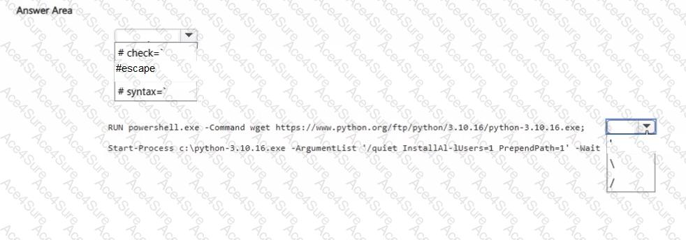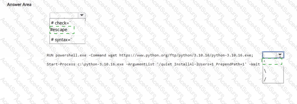 You need to create a Windows Server container image that will include an installation of Python. How should you complete the Dockerfile? To answer, select the appropriate options in the answer area. NOTE: Each correct selection is worth one point.