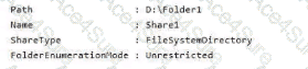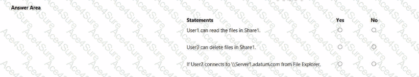 User2 (Group2): NTFS grants Write, but there is no share permission for Group2, so User2 cannot access content through the share. However, the share’s FolderEnumerationMode = Unrestricted (i.e., Access-Based Enumeration is off). As covered in the hybrid core guide, when ABE is disabled, users can see items even if they lack permissions. Thus, when User2 browses \Server1.adatum.com, Share1 is visible (opening it will result in Access Denied).