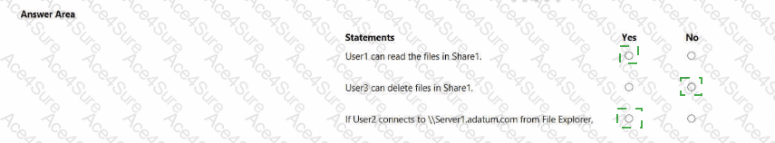 Therefore: Yes (User1 read), No (User3 delete), Yes (User2 sees Share1).
