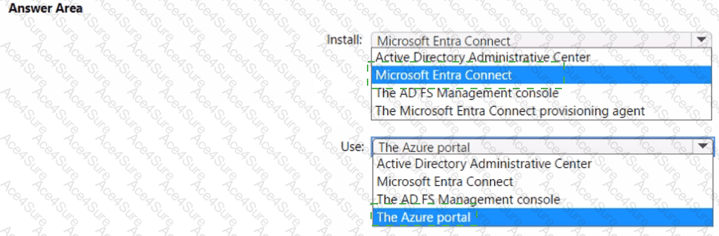 What should you install, and what should you use to enable password hash synchronization? To answer, select the appropriate options in the answer area.