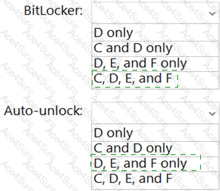On which volumes can you turn on BitLocker, and on which volumes can you turn on auto-unlock? To answer, select the appropriate options in the answer area.
