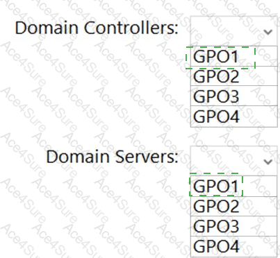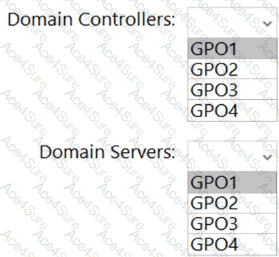 Which GPOs should you apply to the Domain Controllers OU and the Domain Servers OU? To answer, select the appropriate options in the answer area.