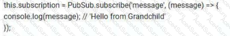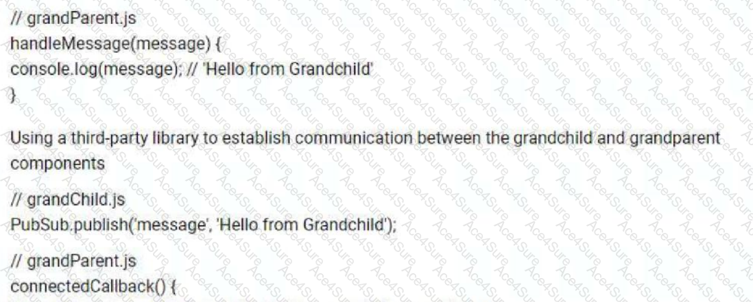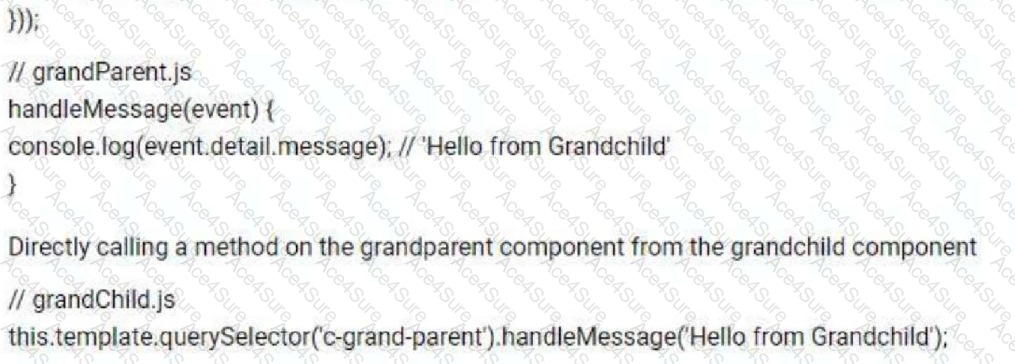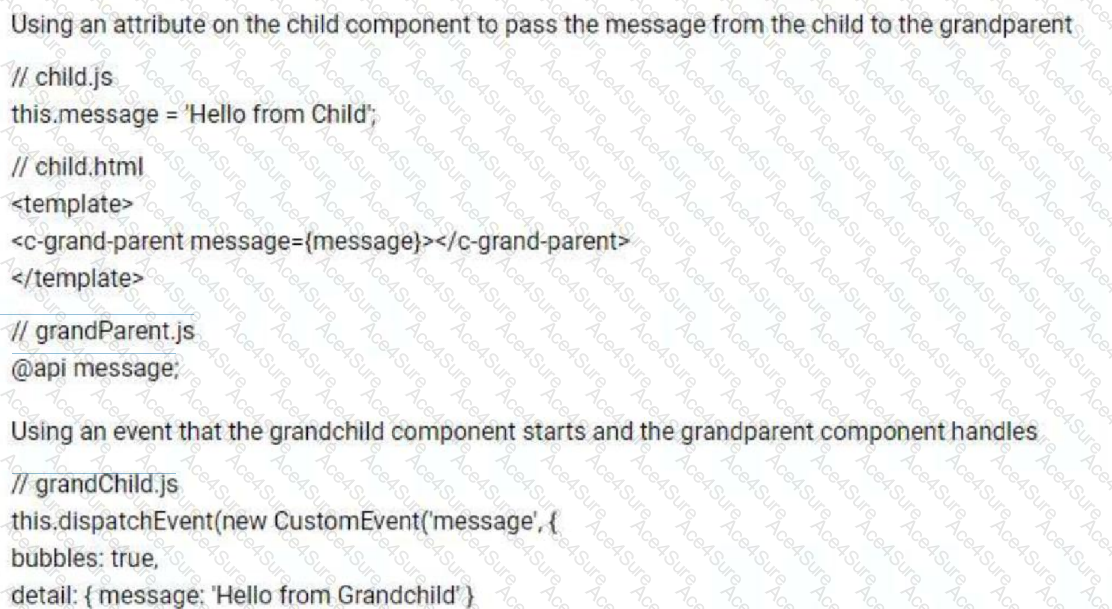 A developer is building a custom component in Lightning web components (LWC) that has a grandchild component that needs to pass information to the grandparent component. What is the correct way to demonstrate the passingof a message from the grandchild component to the grandparent component?