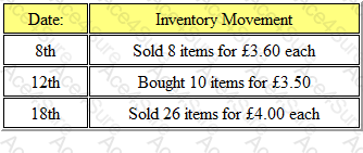 At the beginning of the month, an organization had opening inventory of 30 units of a product, valued at £3.00 each. During the month, it had inventory movements, occurring on the following dates: