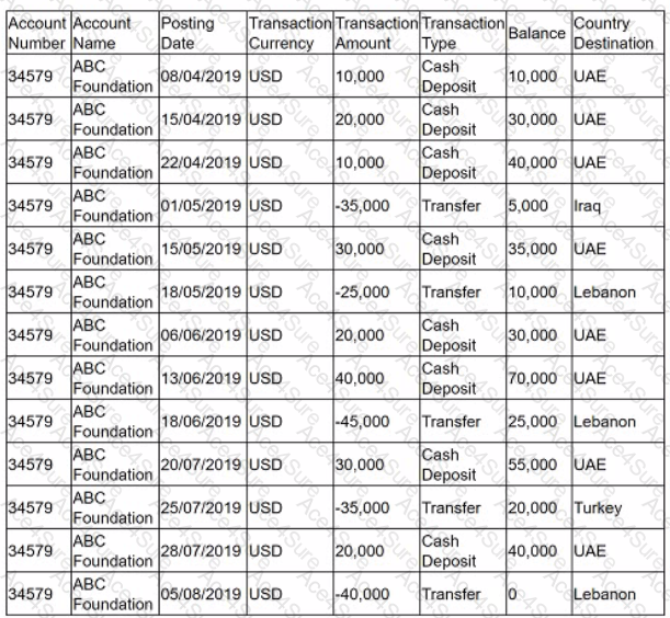 Each month the automated transaction monitoring system generates alerts based on predetermined scenarios. An alert was generated in relation to the account activity of ABC Foundation. Below is the transaction history for ABC Foundation (dates are in DD/MM/YYYY format).