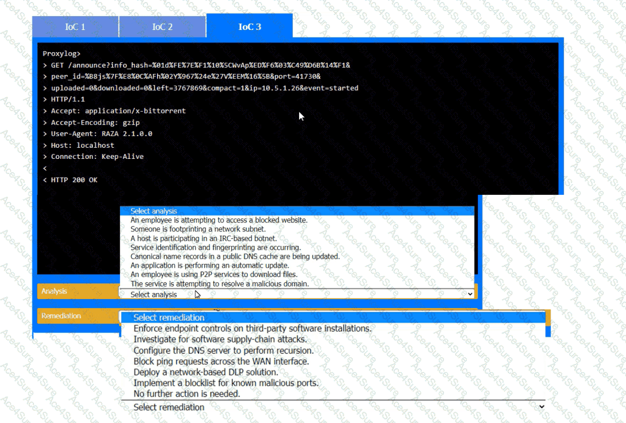 [References:, CompTIA Security+ Study Guide: This guide offers detailed explanations on identifying and mitigating various types of Indicators of Compromise (IoCs) and the corresponding analysis and remediation strategies., CompTIA Security+ Exam Objectives: These objectives cover key concepts in network security monitoring and incident response, providing guidelines on how to handle different types of security events., Security Operations Center (SOC) Best Practices: This resource outlines effective strategies for analyzing and responding to anomalous events within a SOC, including the use of blocklists, endpoint controls, and network configuration changes., By accurately analyzing the nature of each IoC and applying the appropriate remediation measures, the organization can effectively mitigate potential security threats and maintain a robust security posture., , , , , , , , , ]