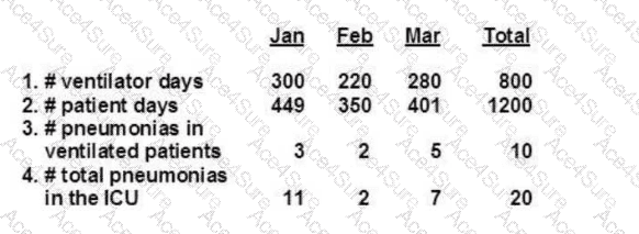 An infection preventionist (IP) is asked to participate on a team to decrease ventilator-associated pneumonia (VAP) rates in a 20-bed ICU. The IP provides the following information. What is the first quarter ventilator utilization ratio?