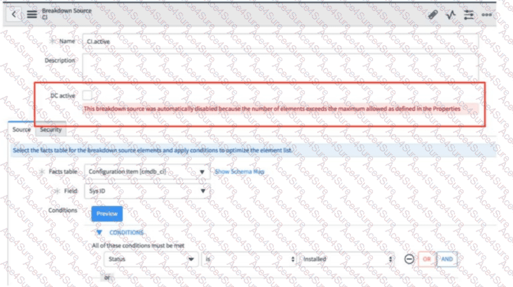 Instead, ServiceNow best practice is torefine the Breakdown Source conditions—for example, by adding filters, narrowing scope, or excluding unnecessary records—so that the number of returned elements fallsbelow the configured system threshold. Once the conditions are optimized, you can safely re-enableDC active, and the breakdown will participate in data collection successfully.