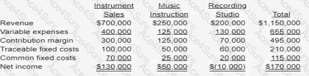 Music Masters Inc. has three departments: Instrument Sales, Music Instruction and Recording Studio The three segments are staffed by different customer service personnel but share space and administrative staff Condensed income statement information follows.