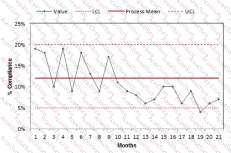 Since the chart is not provided, I’ll consider a typical scenario for a performance improvement context. The question implies the performance improvement coordinator is evaluating long-term performance, and the options suggest looking for trends or changes in compliance. Option D, “There is an increasing trend toward compliance in recent months,” aligns with a common SPC chart interpretation where a trend is identified by a consistent direction in data points over time. In SPC terms, an increasing trend is often defined as six or more consecutive points moving upward, indicating a positive shift in the process (e.g., improved compliance). This interpretation is reasonable for a 21-month period where recent months show improvement, suggesting the revised process is gaining traction.