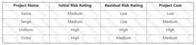 The risk scenario chart shows the initial and residual risk ratings, and the project cost, for four projects named Sierra, Tango, Uniform, and Victor. The initial risk rating is the level of risk before applying any controls or mitigation measures, while the residual risk rating is the level of risk after applying the controls or measures. The project cost is the amount of resources required to implement the project. These three factors can be used to determine the relative positions of the projects on a risk map, which is a graphical tool for displaying the risks based on their impact and likelihood. The risk map can help to prioritize and compare the risks, and to select the most appropriate risk response strategy. The other options are not the best answers, as they are not directly shown or derived from the risk scenario chart. The risk treatment options are the possible actions that can be taken to address the risks, such as accept, avoid, mitigate, or transfer. The capability of enterprise to implement is the ability of the organization to execute the risk response plan,considering the available resources, skills, and constraints. The multiple risk factors addressed by a chosen response are the various elements that contribute to or affect the risk, such as the threat sources, events, vulnerabilities, assets, and impacts. These factors are not explicitly stated or measured in the risk scenario chart, and may require further analysis or information. References = How to Write Strong Risk Scenarios and Statements - ISACA; Identifying the Right Risk Scenarios to Measure with FAIR; How to write good risk scenarios and statements